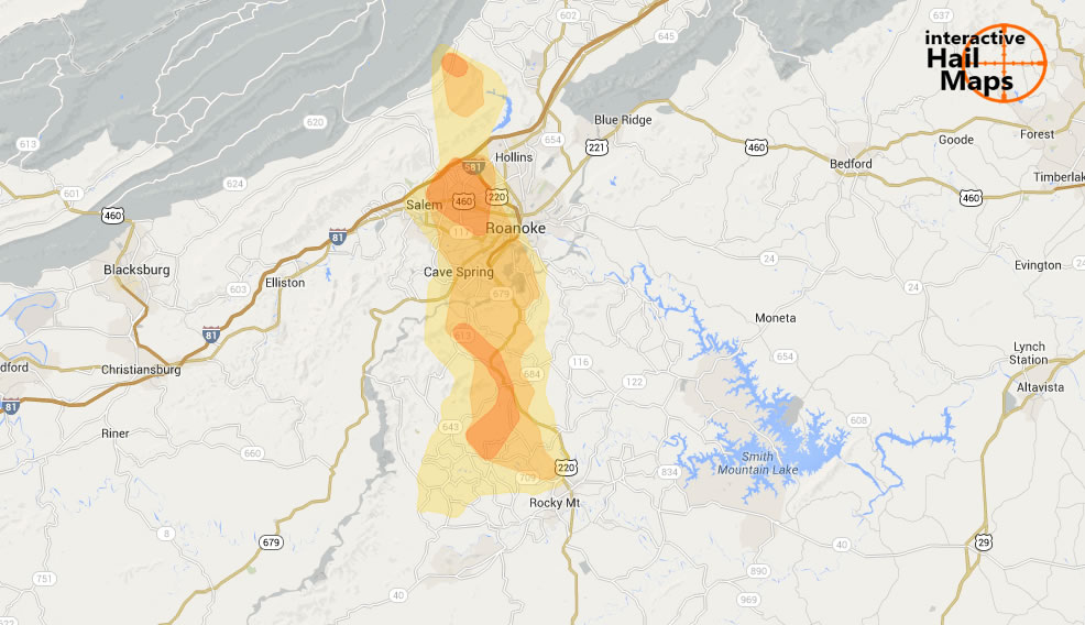 This is the hail map for the hail storm that hit in and around Roanoke, VA on August 1, 2012. The largest and most intense hail fell on the west side of the city. Use Interactive Hail Maps to find hail storms nationwide.