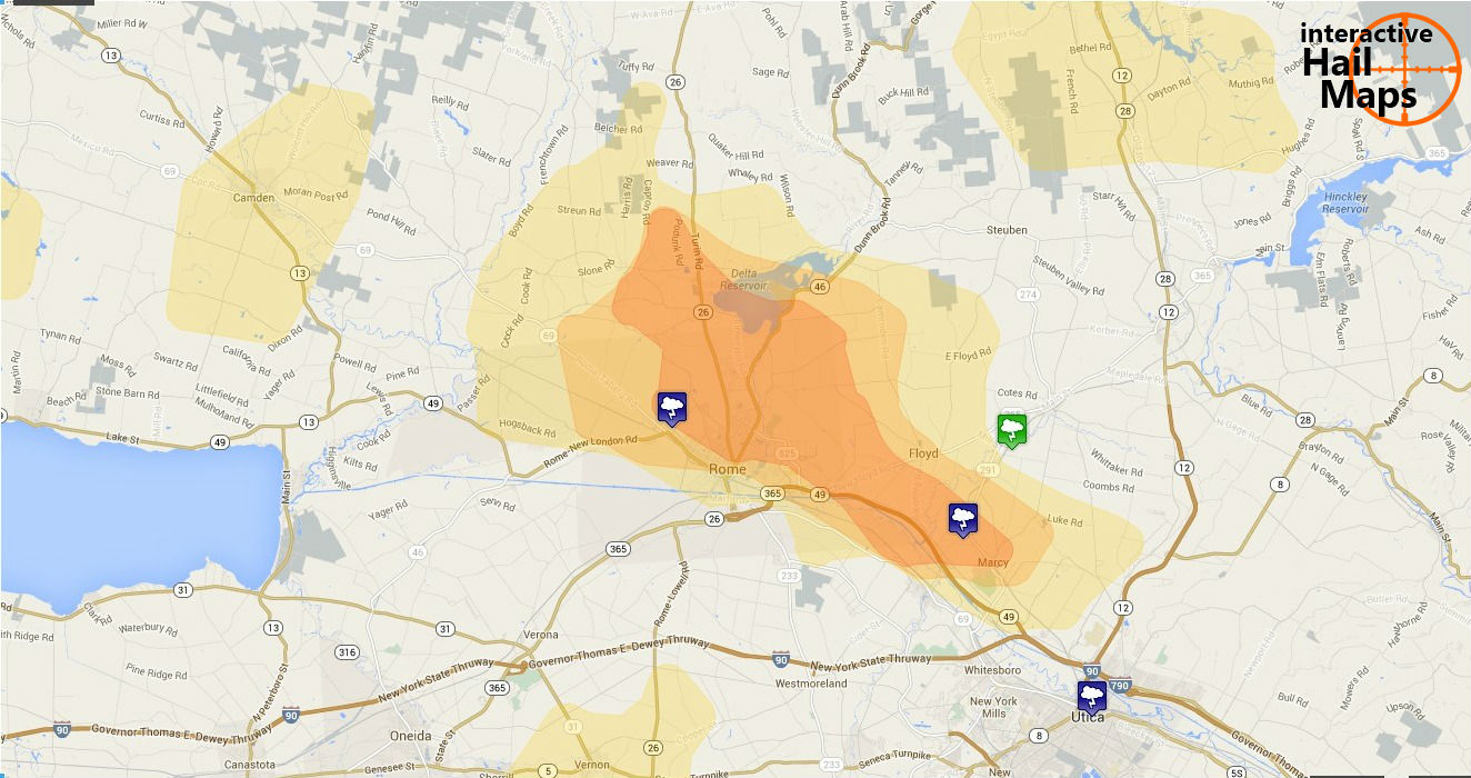 Here is the hail map for Rome, New York on July 23, 2012. Use Interactive Hail Maps to pinpoint hail locations throughout the US and zoom all the way to street view.